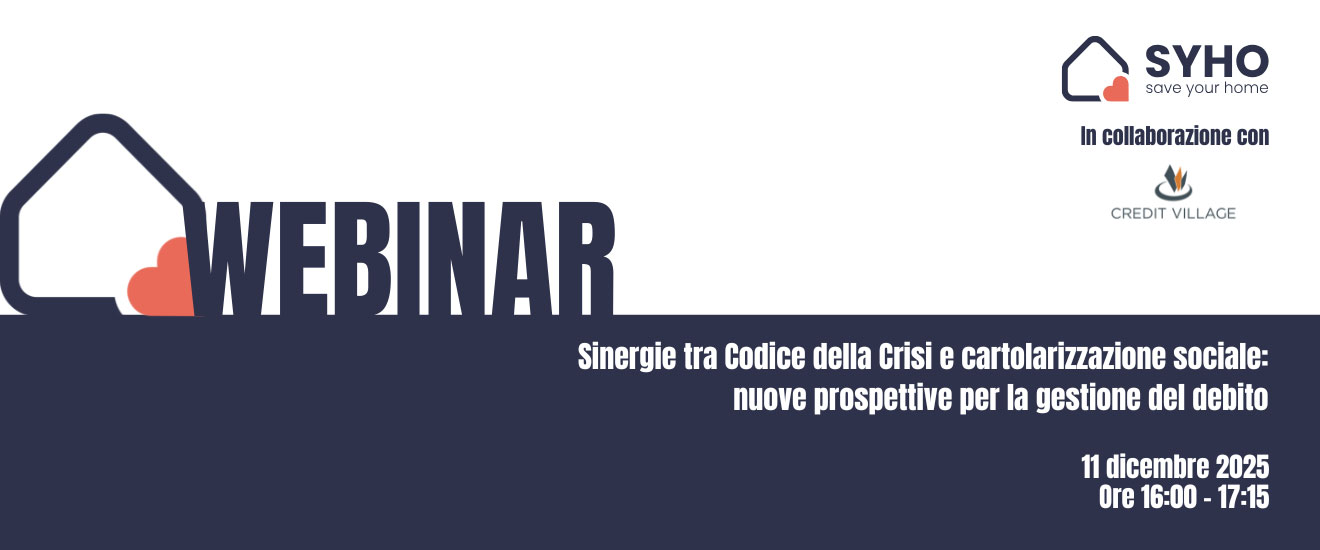 Il webinar, che si terrà il prossimo 11 dicembre dalle ore 16 alle ore 17.15, organizzato da SYHO – Save Your Home in collaborazione con Credit Village, propone un’analisi approfondita dell’incontro tra il nuovo quadro normativo del Codice della Crisi d’Impresa e il modello innovativo della cartolarizzazione a valenza sociale.